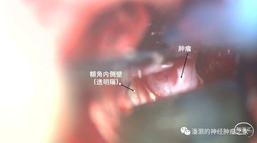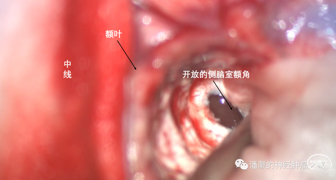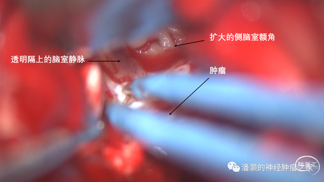 👉向前暴露,切除瘤体后并将肿瘤向后牵拉,可见扩大的侧脑室额角,内侧可见透明隔上的脑室壁静脉。