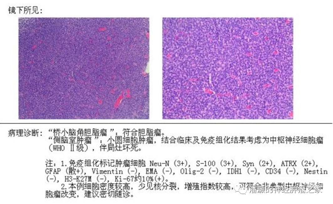 术后病理结果提示中枢神经细胞瘤,予以出院,出院后行放疗进一步治疗。