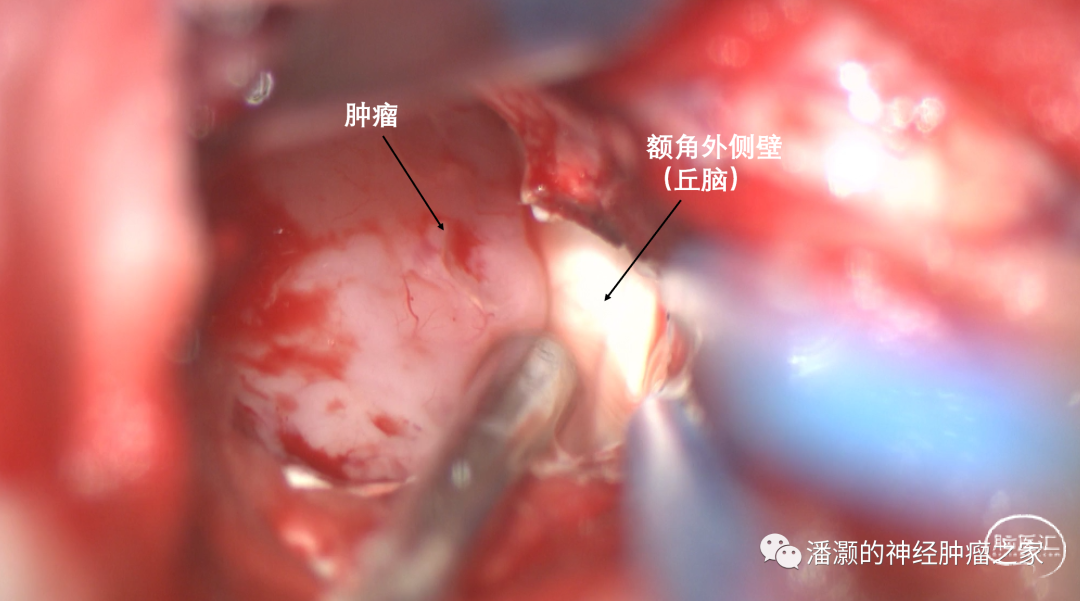 👉继续减压后转向内侧,分离肿瘤与透明隔之间的界面。