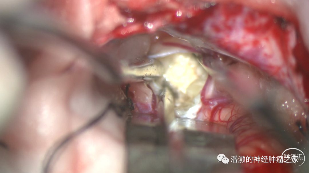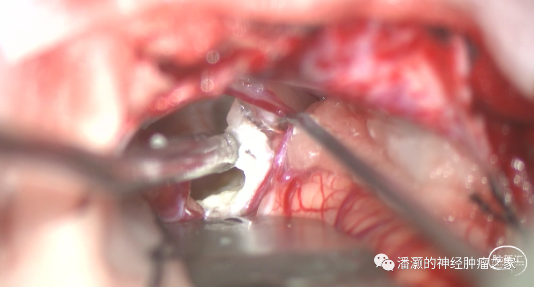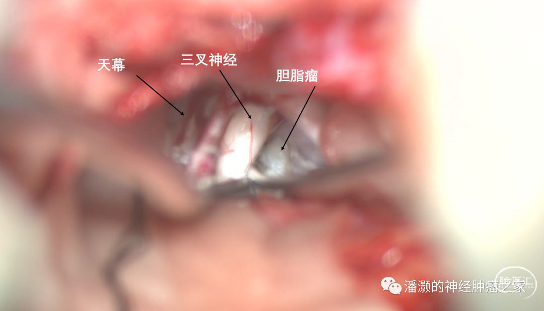 👉胆脂瘤容易沿神经血管间隙生长,探查三叉神经腹侧,仍有肿瘤突入天幕裂孔方向,予以吸除。切除胆脂瘤后常规关颅。