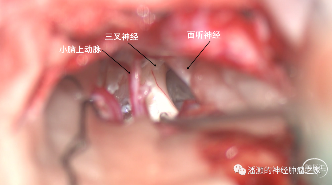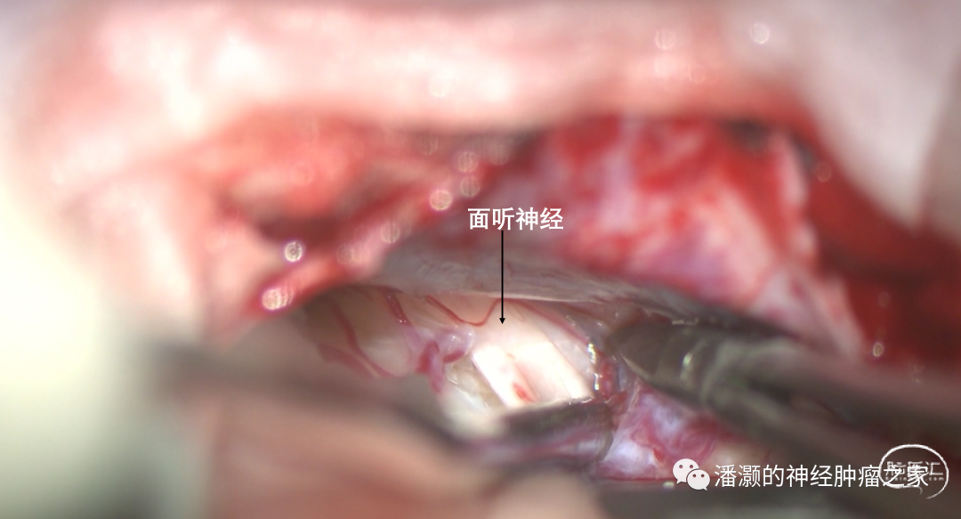 👉右侧枕下乙状窦后开颅,释放脑脊液,小脑牵向内侧后暴露桥小脑角区,胆脂瘤多合并增厚的蛛网膜,予以分离,暴露面听神经。