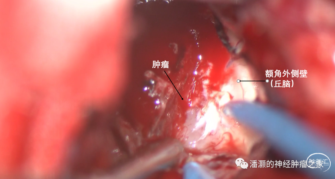 👉牵开脑室,可见肿瘤占据脑室空间,色红,质地稀软,向周边探查可见正常脑室壁结构,外侧为丘脑。明确肿瘤周边利于寻找肿瘤边界,保护脑室内的丘脑、深部静脉系统等重要结构。