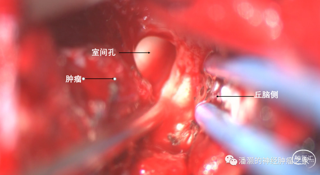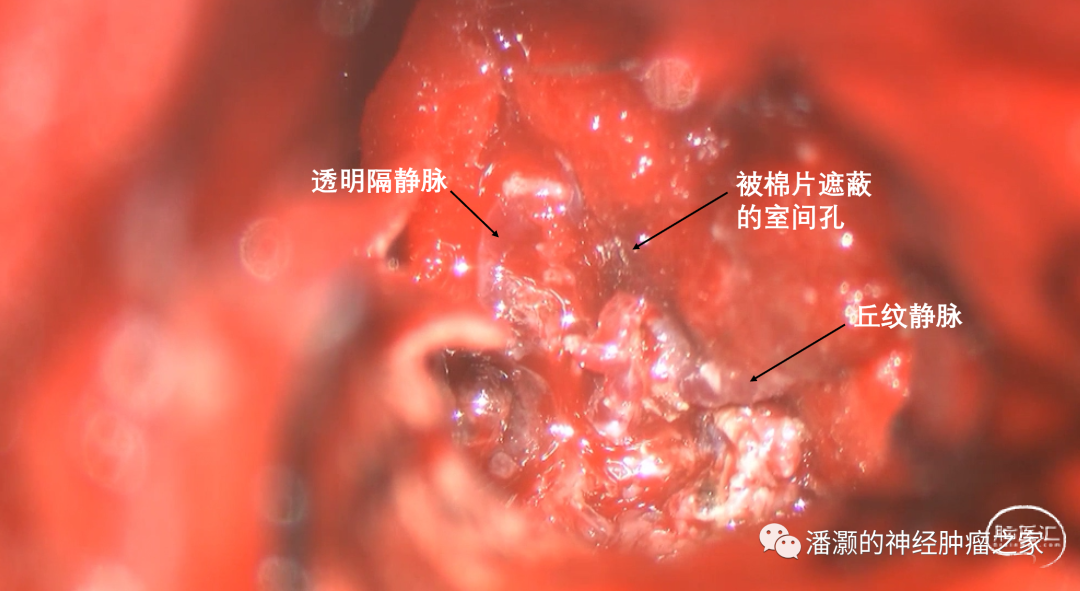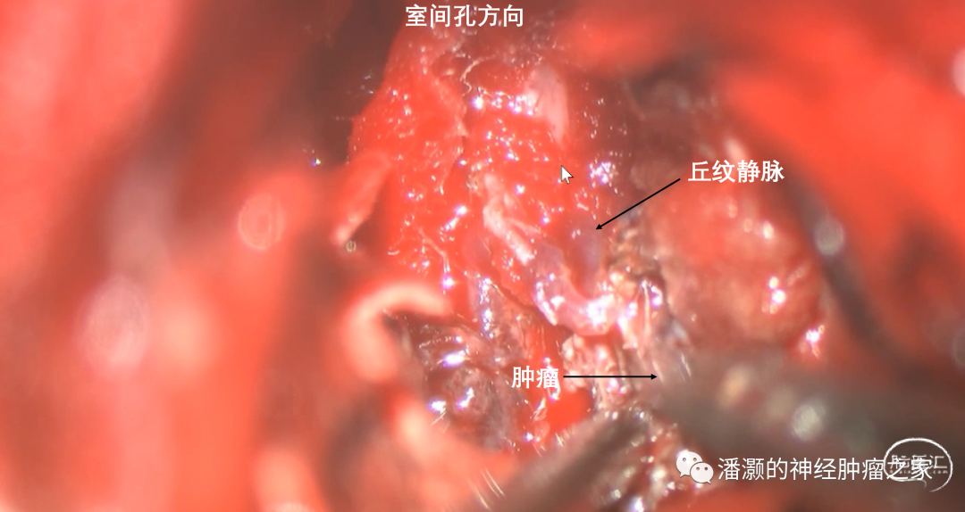 👉沿透明隔向后切除肿瘤,可见室间孔结构。室间孔后下方应注意寻找丘纹静脉。