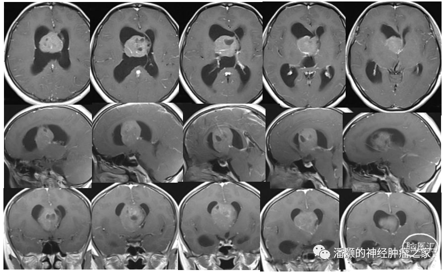 脑室内占位呈混杂信号,与丘脑、透明隔关系密切,强化明显,内有混杂信号。强化可见大脑内静脉位于肿瘤下方。结合影像特征,考虑中枢神经细胞瘤。