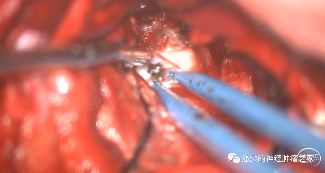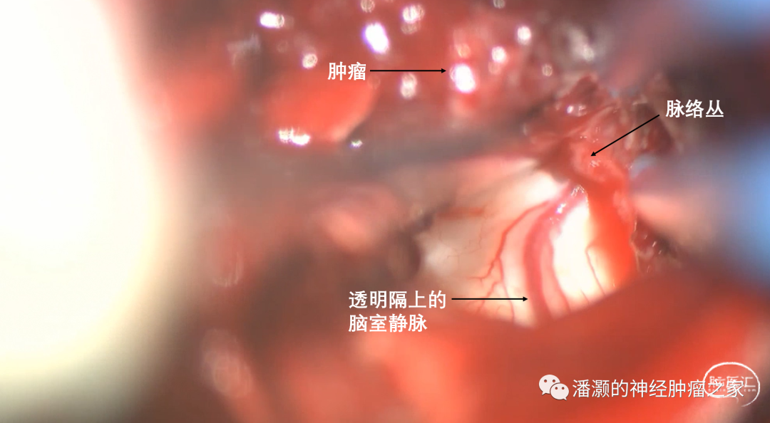 👉因为前方肿瘤对室间孔后方挤压严重,难以分辨,所以再次从肿瘤后方寻找脉络丛,借此结构试图向前方寻找丘纹静脉。