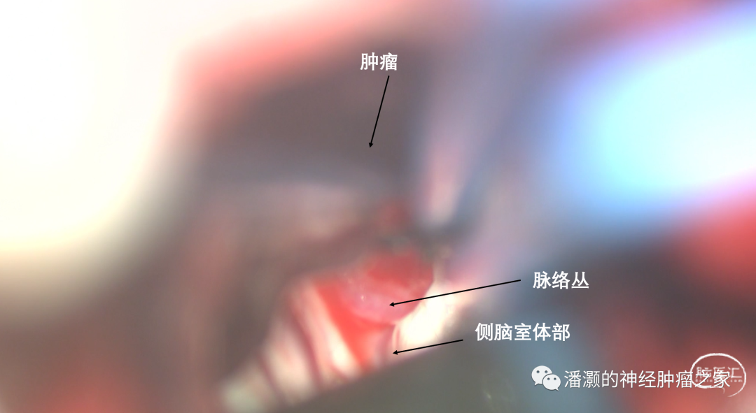在手术时,可以通过脉络丛来进一步辨认脑室内结构,确定方位方向。此外,因为室间孔部位容易出现术后的肿胀导致梗阻,可以通过透明隔造瘘来进行左右脑室沟通,避免梗阻性脑积水的出现。