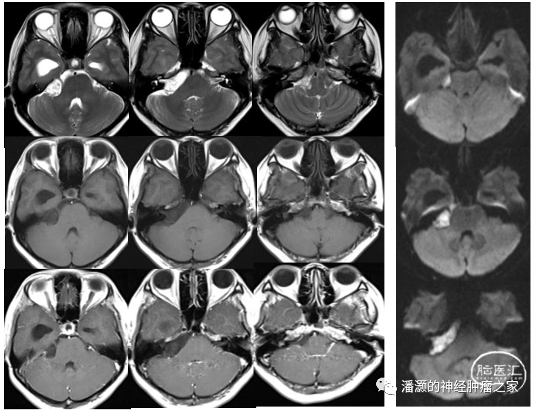右侧CP角占位T2高信号、T1低信号,无强化,弥散成高信号,诊断考虑胆脂瘤。