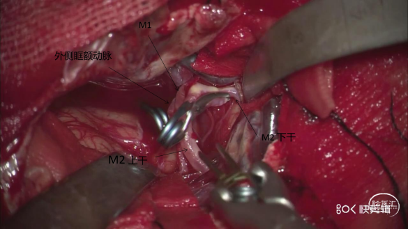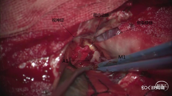全麻成功后,取平卧位,头左偏约40°,标记发髻内右侧翼点入路切口,于关建孔、顶部钻孔2枚,去除骨瓣,咬平蝶骨嵴,硬膜张力不高,弧形打开硬膜,由外向内分离外侧裂,显露视神经及ICA近端,抬额叶过程中动脉瘤顶部视神经旁一小穿支血管破裂出血,给予明胶海绵、棉片压迫,临时阻断C6近端,见瘤体呈红色、壁薄,夹闭瘤颈过程中,瘤顶部破裂出血,瘤颈1次夹闭成功。再依次分离M1主干、上干及下干,暴露分叉动脉瘤,临时阻断M1,夹闭动脉瘤,调整瘤夹位置直至夹闭完全。