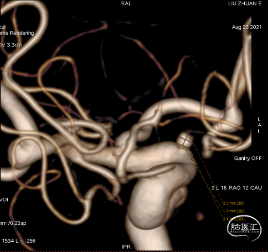 C6-7段动脉瘤位于颈内动脉上壁,指向内上方,考虑血泡样动脉瘤,结合蛛血位置,及动脉瘤形态、大小,考虑颈内动脉血泡为责任动脉瘤。