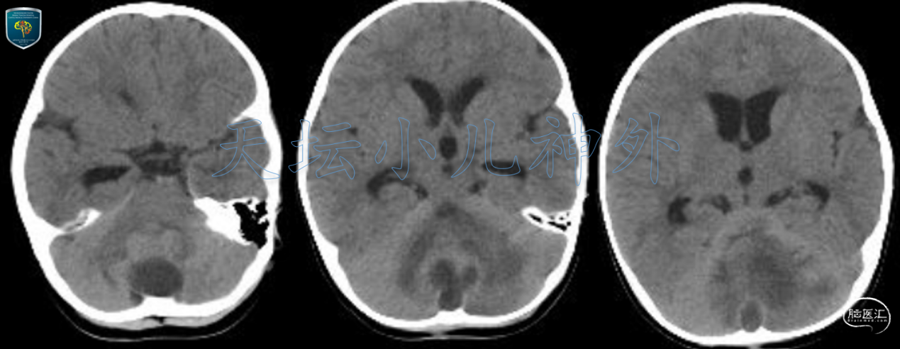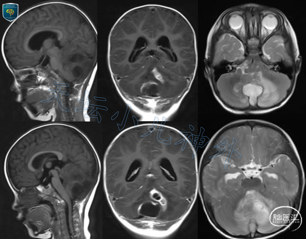 2020年10月接诊一例来自河北省保定市的1岁女性患儿(85cm,11.0kg)。主诉:枕后头皮感染清创术后3月,发现颅内占位一月余。患儿出生时发现枕部头皮小包块、表面生长有硬韧的毛发,未予重视。3月前局部外伤后枕部包块迅速增大,于当地医院行包块切除,术后高热,行头孢噻肟抗菌治疗20余天后好转,复查头部CT发现颅内占位,考虑髓母细胞瘤,遂来我院就诊。门诊查体示:患儿神情,精神状态好,查体欠配合,枕后局部切口愈合好,无红肿及溢脓溢液,余神经系统查体阴性。我院头颅CT显示:后颅窝中线团块状低密度影,边界模糊,密度不均,周围可见大片水肿区,大小约46X45mm(图1);头颅MRI提示后颅窝中线处长T1长T2病变,局部囊性变,囊壁光滑,边界不清晰,DWI呈显著弥散受限,多发囊腔显著环形强化,病变周围水肿明显,脑脓肿可能性大(图2)。