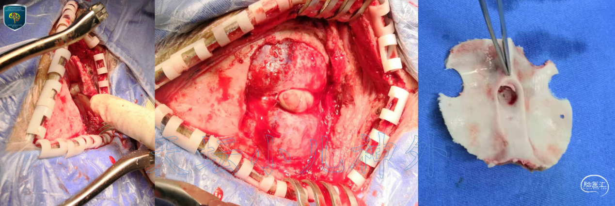 结合病史及影像学特征,患儿先天性皮毛窦,外伤后局部感染,当地医院封闭皮肤窦口,造成颅内感染形成后颅窝脑脓肿可能性大。手术指征明确,完善术前检查,于2020年10月19日在全麻下行枕下后正中入路脑脓肿清除+皮毛窦窦道封闭术。术中见枕外粗隆上方颅骨窦道凹坑,骨瓣下可见黄色脓栓呈芽状突出于硬膜外,和颅骨窦道粘连紧密(图3)。全层磨除颅骨窦道,骨瓣清洗干净备用。切开硬脑膜见硬脑膜和脓肿粘连紧密,枕窦不发达,黄色脓肿呈团块状嵌入两侧小脑半球之间,有不连续的包膜,厚薄不均。在电生理监测下,沿脓肿周边耐心分离,局部破溃溢出黄色粘稠米汤状脓液。脓肿壁压迫脑干背侧,局部粘连,锐性游离。脓肿周边组织呈黄色油膏状,血供不丰富,与脓肿一并清除,双氧水反复术腔冲洗干净,人工硬膜减张缝合,骨瓣复位。手术顺利,出血约150ml,输异体红细胞130ml。