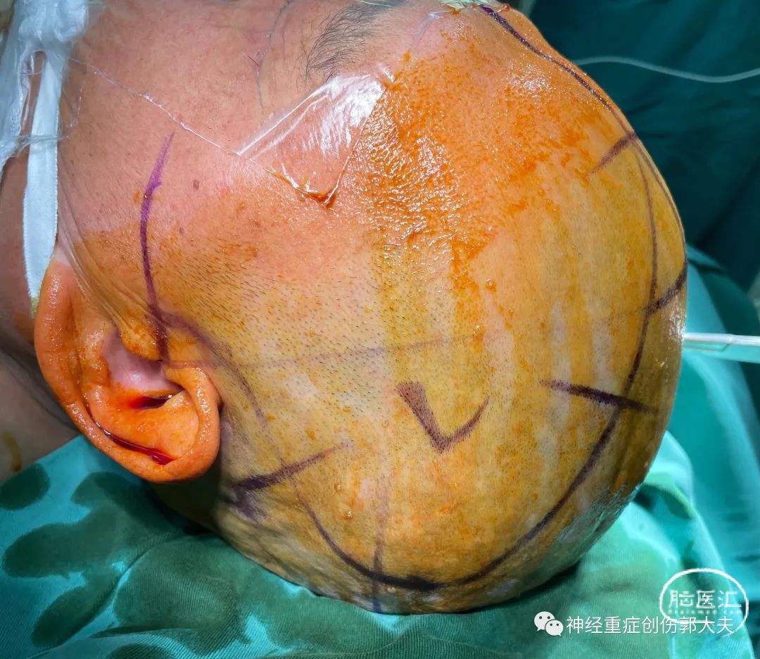 完善全脑血管造影后未见明显颅内动脉瘤及血管畸形,急诊行右额颞开颅血肿清除+去骨瓣减压术。
