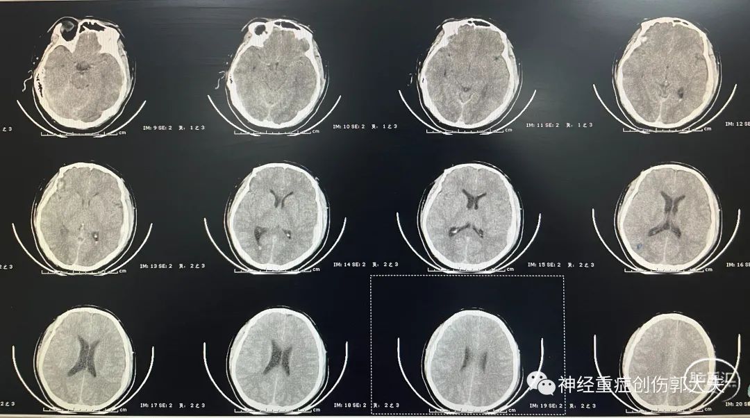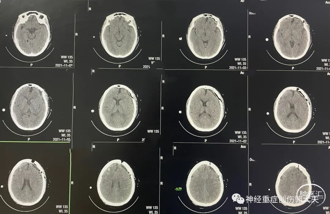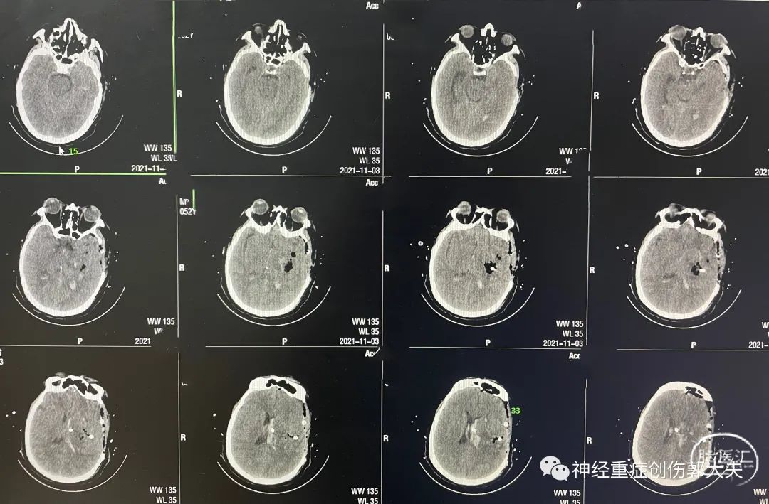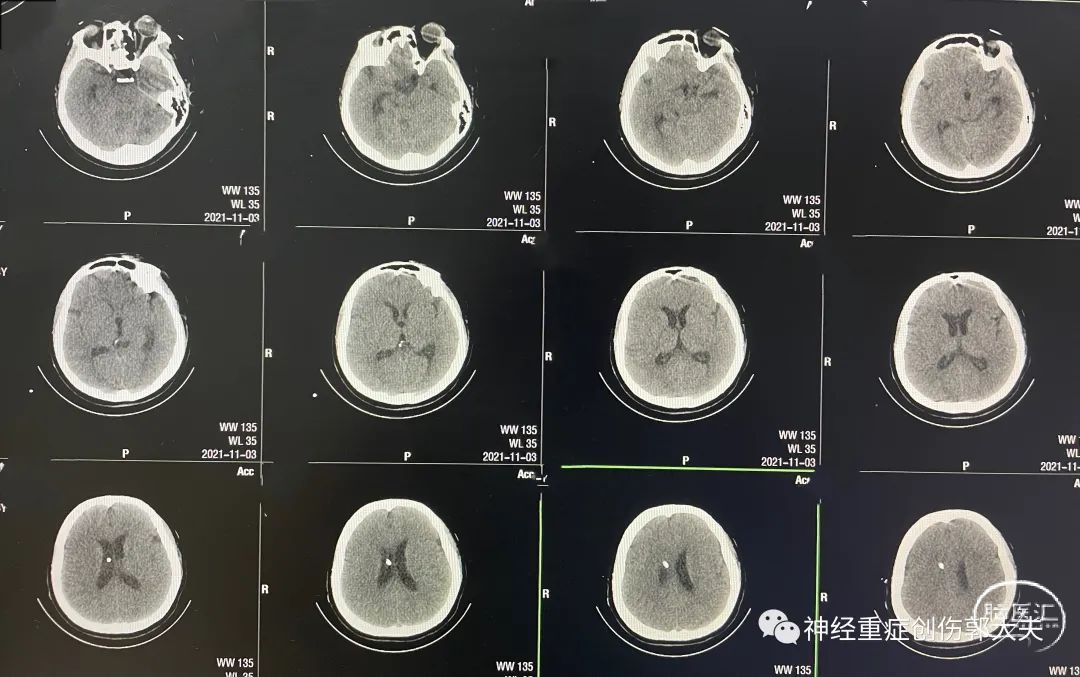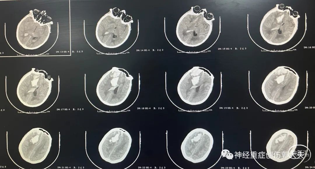 急诊行右侧脑室外引流+左额颞顶开颅血肿清除+去骨瓣减压术,术后复查移动CT显示引流管位于侧脑室内,血肿清除满意。