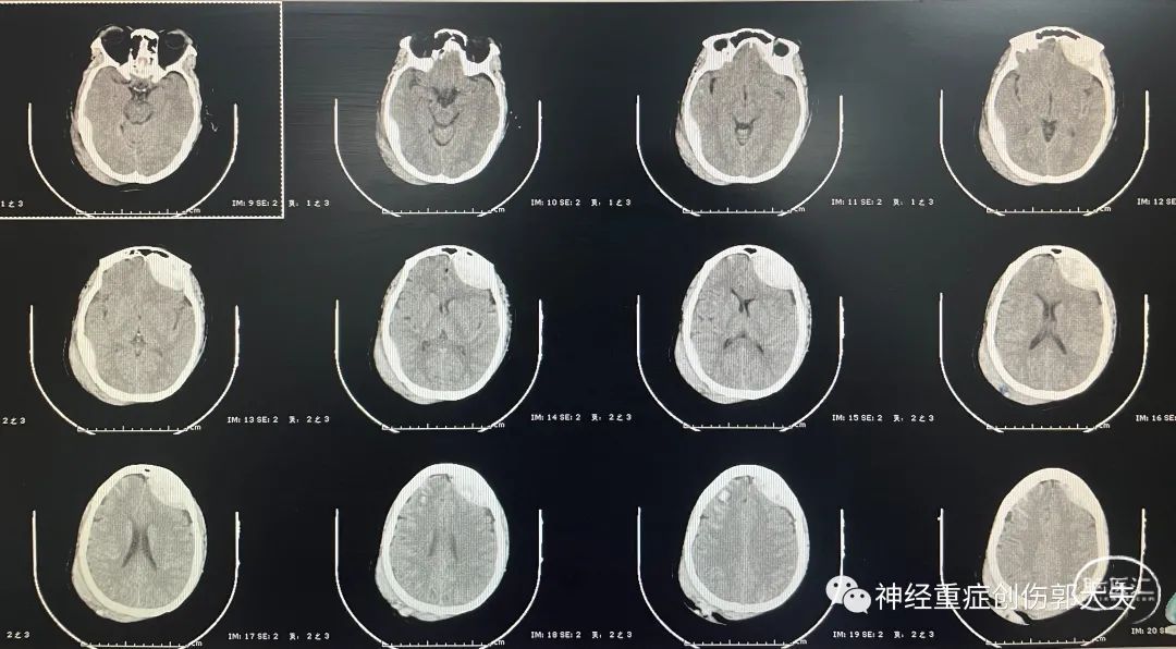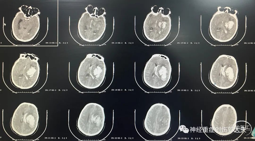 患者男性,36岁,主因“高处坠落致头部外伤1天”入院,神志浅昏迷,GCS9分,头颅CT显示右额叶脑挫裂伤,左颞叶急性硬膜下血肿,蛛网膜下腔出血。