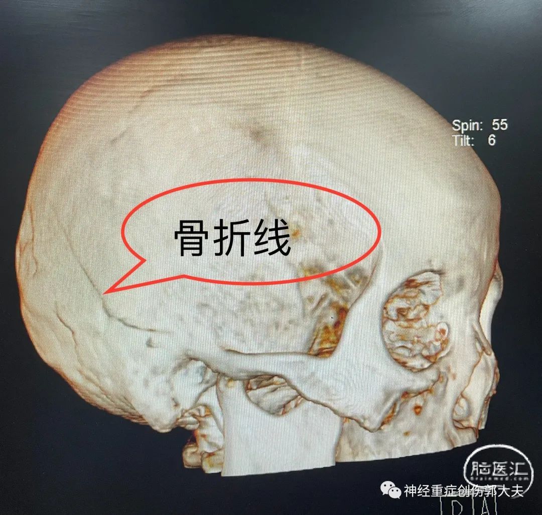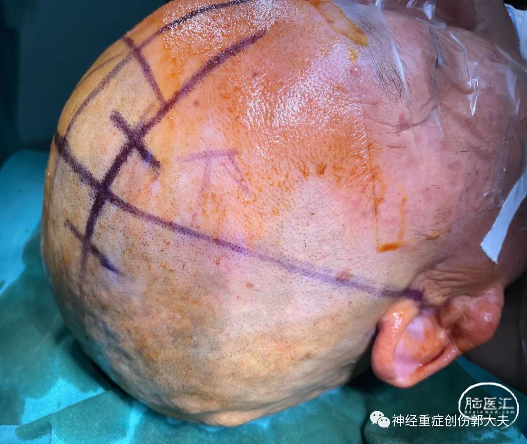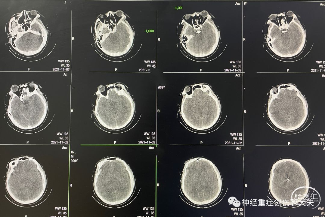 患者女性,60岁,主因“不慎摔倒致头部外伤15小时”入院。神志嗜睡,GCS14分,头颅CT显示左额及右颞枕部急性硬膜外血肿,右额叶脑挫裂伤,蛛网膜下腔出血,左颞骨骨折。