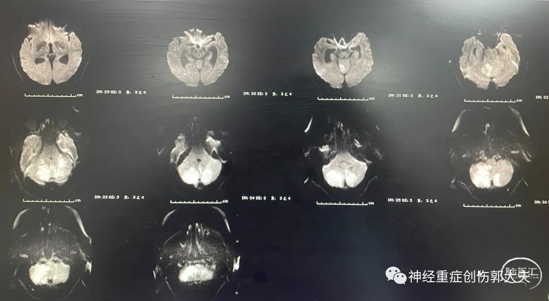 患者女性,34岁,主因“头晕4天,加重2天”入住我院神经内科,神志清楚,完善头颅核磁显示双侧小脑半球及丘脑大面积脑梗死。