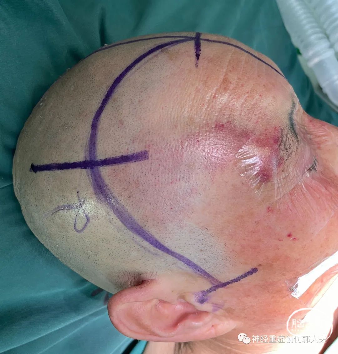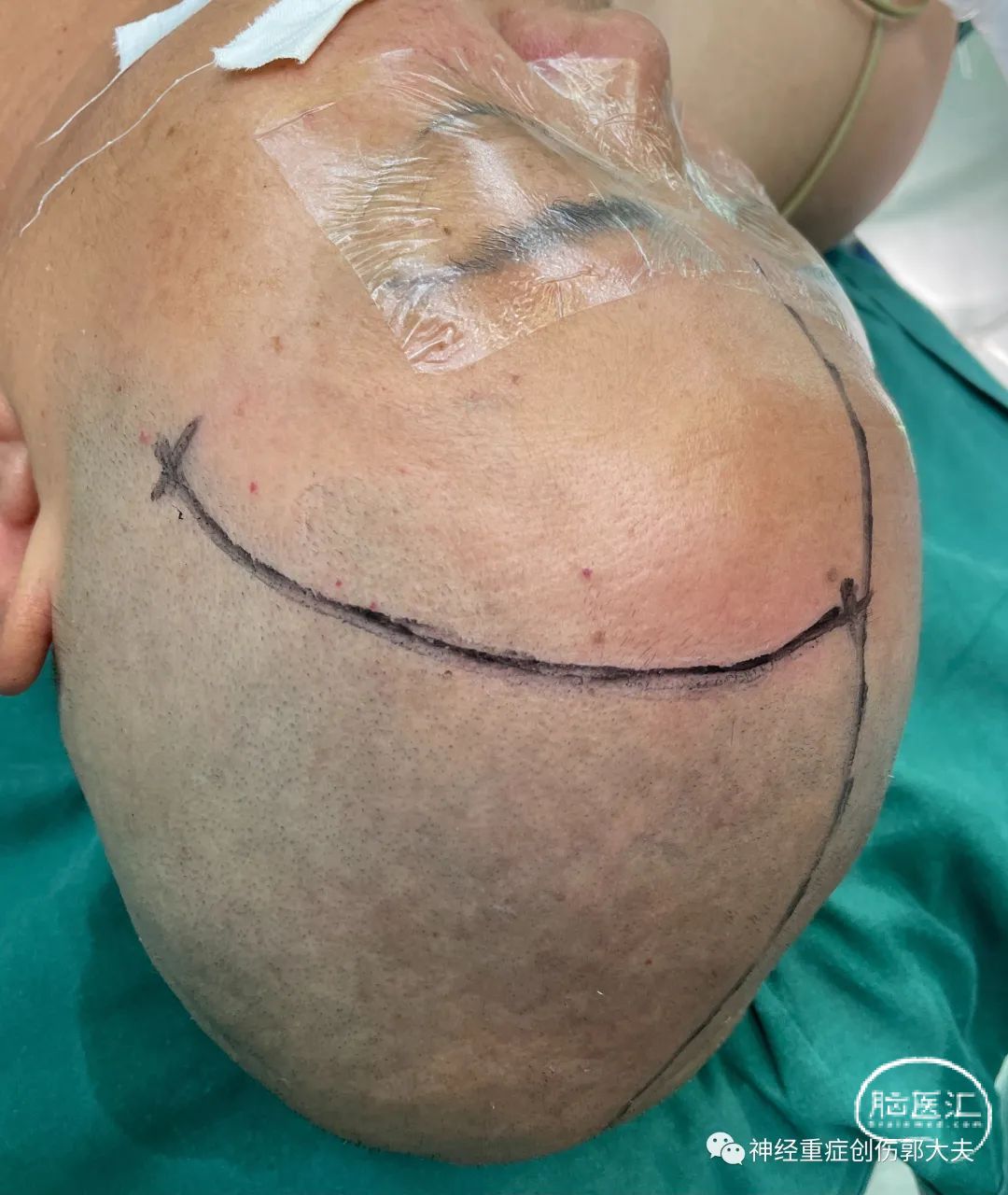 患者左额硬膜外血肿量大,拟行左额硬膜外血肿清除术。考虑患者为对冲伤,右颞骨折、少量硬膜外血肿,所以术中减压不要太快,密切注意颅压,避免右颞硬膜外血肿增加。