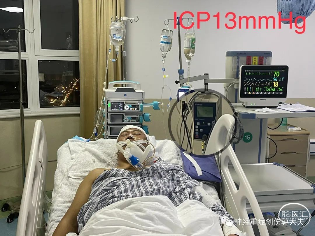 患者颅内血肿量并不大,但是GCS评分低,根据颅内压监测共识,给予置入脑室型颅内压探头。术中初压32mmHg,经过缓慢释放少量脑脊液后下降为17mmHg。术后返回神经外科ICU,复查移动CT显示探头位置位于侧脑室内,ICP波动于10-20mmHg。