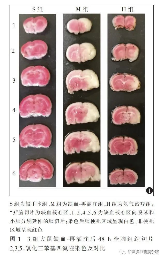 建立大脑中动脉栓塞模型[10],3 组实验大鼠经面罩给予5%七氟烷进行麻醉诱导,2% ~ 3% 七氟烷用于麻醉维持,保留自主呼吸。术区备皮消毒,1%利多卡因局部浸润麻醉后在颅顶两耳连线中点做一约0. 5 cm 正中切口,寻找前囟,以前囟为零点,在前囟左侧4 mm、尾侧1. 5 mm 处固定脑血流探头,应用激光多普勒脑血流检测仪进行脑血流监测。缓慢翻身,颈部备皮消毒,1%利多卡因局部浸润麻醉后行正中切口,显微镊钝性分离皮下组织,暴露左侧胸锁乳突肌,逐步游离二腹肌、胸锁乳突肌及肩胛-舌骨肌,肌间可见到左侧颈动脉鞘。钝性分离颈总动脉、颈外动脉及颈内动脉。电凝离断颈外动脉与颈内动脉之间的交通支及颈外动脉侧支,结扎并离断左侧颈外动脉,S 组操作截止至此步骤,M 组与H 组后续使用动脉夹夹闭颈总动脉近心端及颈内动脉远心端,从颈外动脉残端置入线栓,脑血流突然下降,下降幅度大于基础值70%以上,固定线栓,缝合切口。记录线栓插入时间及脑血流值。栓塞90 min后取出线栓。术后送至小动物麻醉后监测治疗室苏醒,并进行保温。待大鼠清醒后进行Longa 评分,2 分即为建模成功[10]。H 组大鼠建模成功后吸入氢气。
