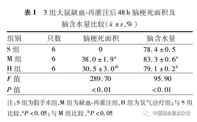 如图1,表1 所示,与S 组比较,M 组脑梗死面积及脑含水量明显增加(均P < 0. 05);与M 组比较,H 组脑梗死面积及脑含水量明显减少(均P <0.05)。