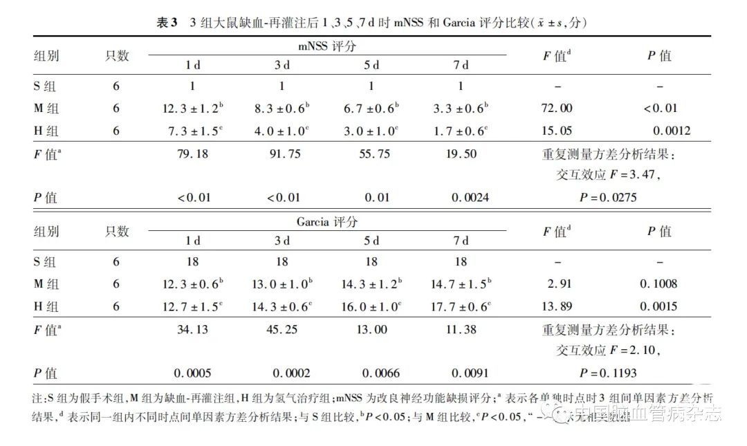 与S 组比较,M 组大鼠缺血-再灌注后1、3、5、7 d时,mNSS 明显升高,Garcia 评分明显减低;与M 组比较,H 组大鼠缺血-再灌注后1、3、5、7 d 时,mNSS明显减少,Garcia 评分明显升高,差异均有统计学意义(均P <0. 05=。见表3。
