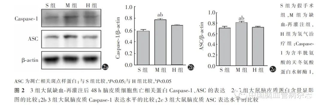 方法 纳入雄性健康无特定病原体(SPF)级Sprague Dawley(SD)大鼠72 只,采用随机数字表法进行完全随机化分组,将实验动物随机分为3 组,分别为假手术组(S 组)、脑缺血-再灌注组(M 组)和氢气治疗组(H 组),每组24 只。S 组结扎并离断左侧颈外动脉,M 组与H 组建立大鼠大脑中动脉栓塞(MCAO)模型,S组、M组大鼠于再灌注前1 h、再灌注后20 h和44 h 3个时间点吸入45 min 空气(21%O2-78%N2),H组于再灌注前1 h、再灌注后20 h和44 h 3 个时间点吸入45 min 高浓度氢气(42% H2-21% O2-37% N2)。于再灌注后48 h 断头处死大鼠,观察大鼠脑梗死面积及脑组织水肿情况,采用Western blot 法检测细胞焦亡相关蛋白含半胱氨酸的天冬氨酸蛋白水解酶1(Caspase-1)及凋亡相关斑点样蛋白(ASC)含量,采用酶联免疫吸附测定(ELISA)方法检测白细胞介素1β(IL-1β)和IL-18 水平,并记录大鼠缺血-再灌注后1、3、5、7 d 时神经功能评分[改良神经功能缺损评分(mNSS)、Garcia 评分]、体质量变化情况以及生存状况。