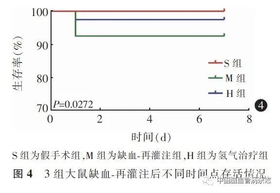 大鼠死亡集中于再灌注后24 h 内,共有8 只大鼠死亡,M 组死亡6 只,H 组死亡2 只,S 组大鼠无死亡。两组大鼠生存率比较结果显示,H 组大鼠生存率高于M 组大鼠(P =0. 0272)。见图4。