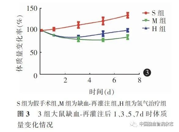如表4,图3 所示,S 组大鼠体质量无降低且逐渐增加,H、M 组大鼠体质量均先减低再恢复,H 组大鼠再灌注后体质量减低幅度小于M 组,且早于M 组恢复至初始水平。