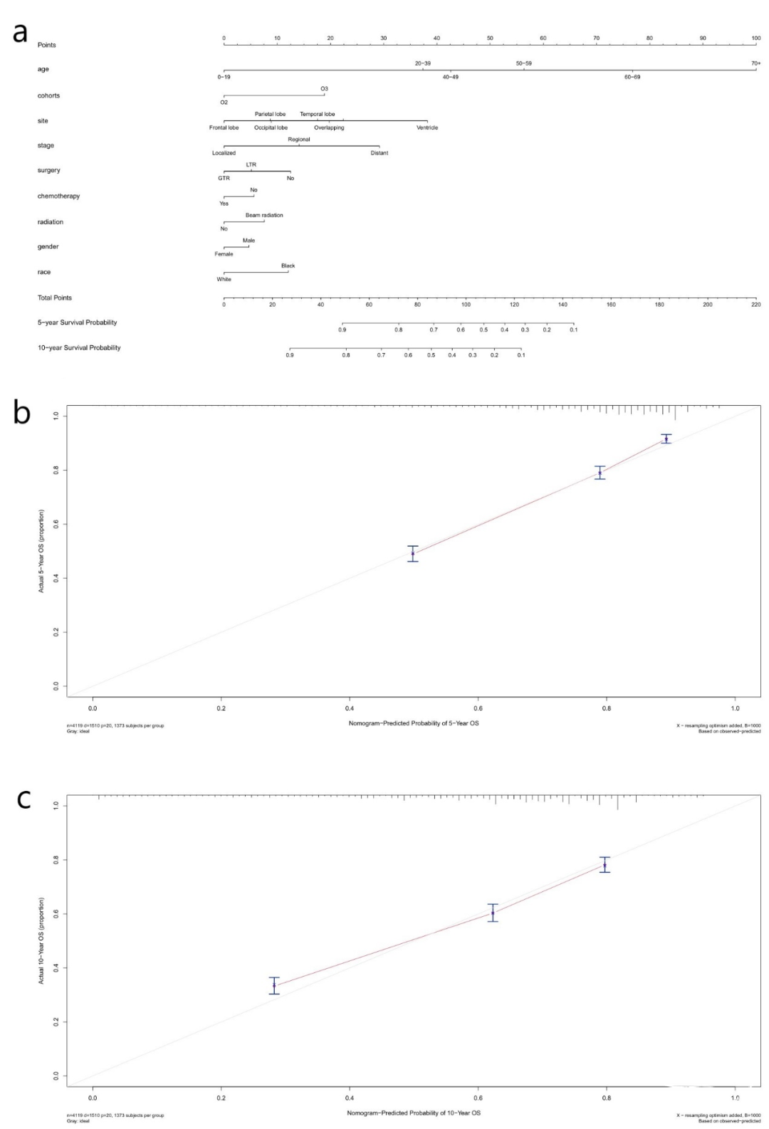 方法:从SEER数据库选择1975年至2016年间确诊的病例。通过单变量和多变量分析,评估年龄、性别、种族、保险、诊断年份、婚姻状况、肿瘤位置、肿瘤大小、总结阶段、手术方法、放疗和化疗的使用对总生存率的影响。构建并验证了预测少突胶质细胞瘤5年和10年生存率的列线图。