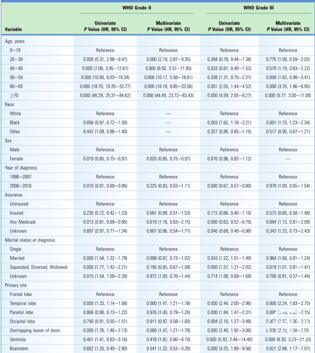 [REF:Cao L, Rong P, Zhu G, Xu A, Chen S. Clinical Characteristics and Overall Survival Prognostic Nomogram for Oligodendroglioma: A Surveillance, Epidemiology, and End Results Population-Based Analysis. World Neurosurg. 2021 Jul;151:e810-e820. doi: 10.1016/j.wneu.2021.04.122. Epub 2021 May 5.] PMID: 33964496