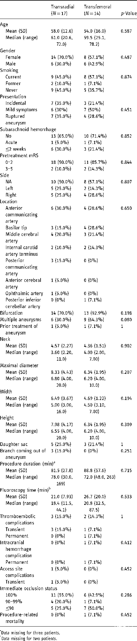 表2. 经桡动脉入路和经股动脉入路进行WEB栓塞的基线特征和结果比较。a:3名患者数据缺失;b:2名患者数据缺失。