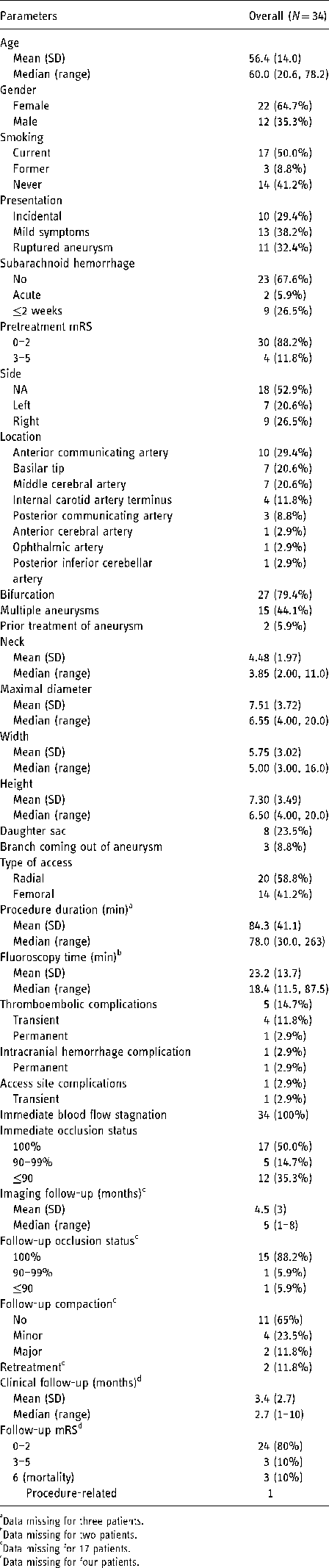 共纳入34例患者。中位年龄为60岁,男女比为1:2,大多数患者在就诊时没有症状或有轻微症状(例如头痛),其中11名(32.4%)患者出现动脉瘤破裂。27个(79.4%)动脉瘤为分叉动脉瘤,主要位于前交通动脉(29.4%)和基底动脉尖端(20.6%)。动脉瘤最大直径和颈部大小分别为6.5毫米和4.5毫米(表1)。分别有20(58.8%)例和14(41.2%)例患者进行了经桡和经股入路。两组的中位手术时间和透视时间分别为(78.0分钟 vs 72.0分钟,p=0.715)和(18.4分钟 vs 20.8分钟,p=0.533)(表2)。所有病例都成功置入了WEB设备,没有患者需要切换手术入路。两个(6.1%)患者在动脉瘤中放置了额外的线圈,六个(18.2%)患者放置了支架。所有病例均出现即刻血流停滞,22例(64.7%)完全或接近完全闭塞(>90%)。围手术期血栓栓塞并发症发生率为14.7%;一例患者死亡率(2.9%)。