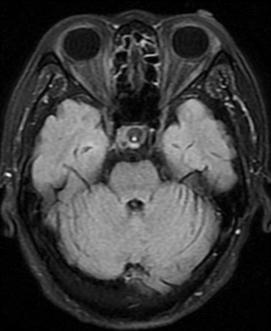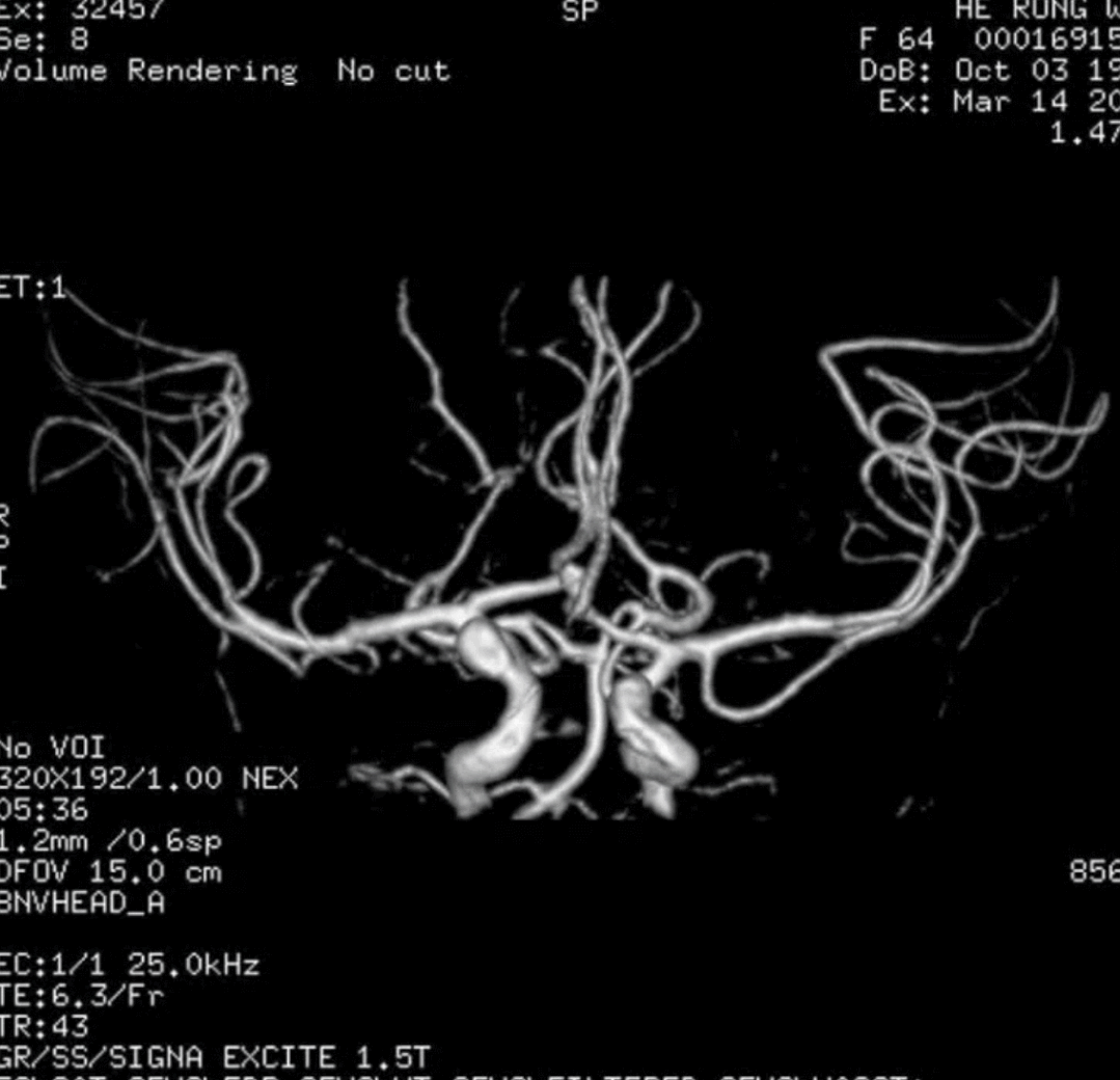 🔆 行头MRI+MRA示:脑内散在小缺血灶;老年性脑萎缩;双侧颈内动脉床突上段动脉瘤