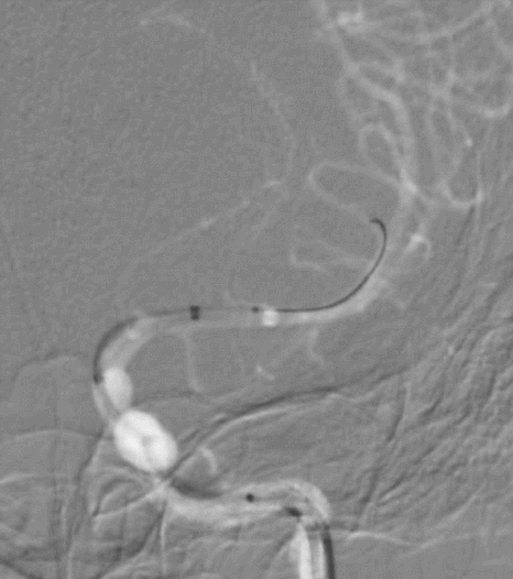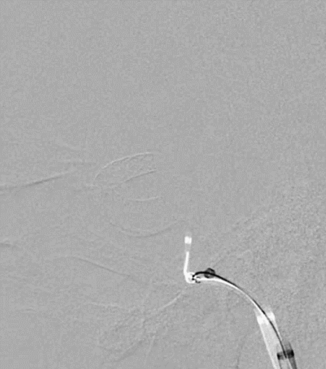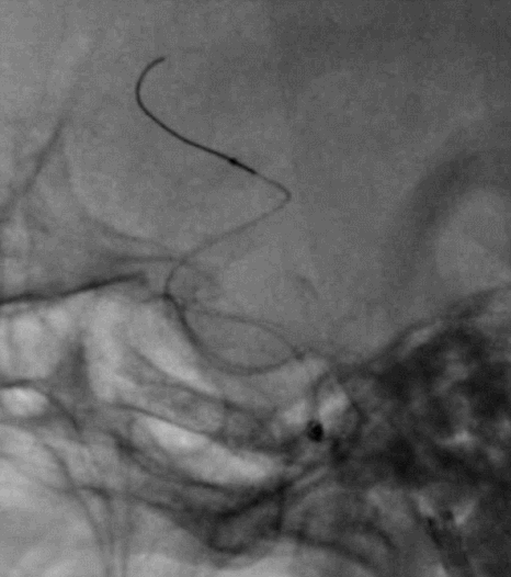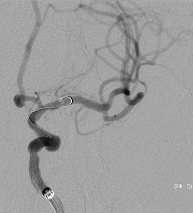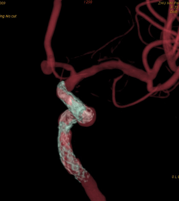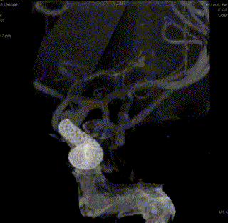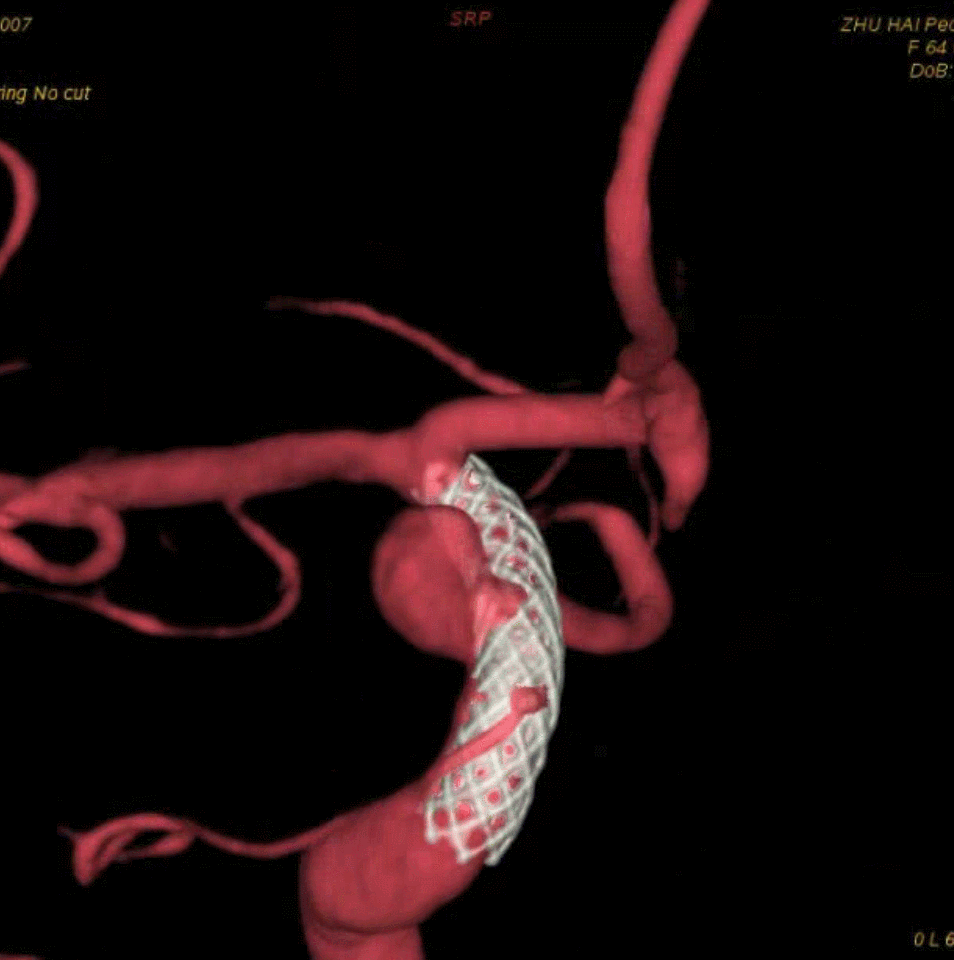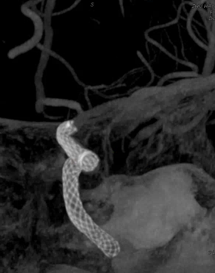 经Cat5完全释放支架后,拉推送杆后支架近端打开,后将Cat5跟进血流导向装置内尝试“按摩”,支架整体贴壁不够理想。