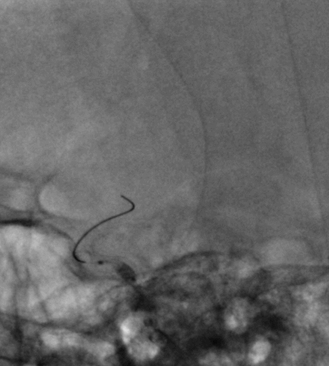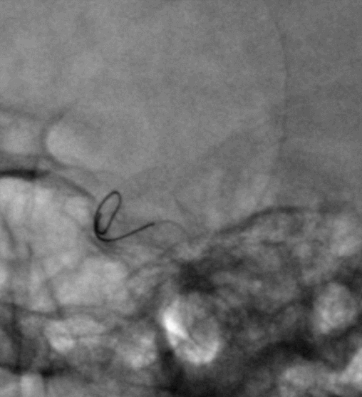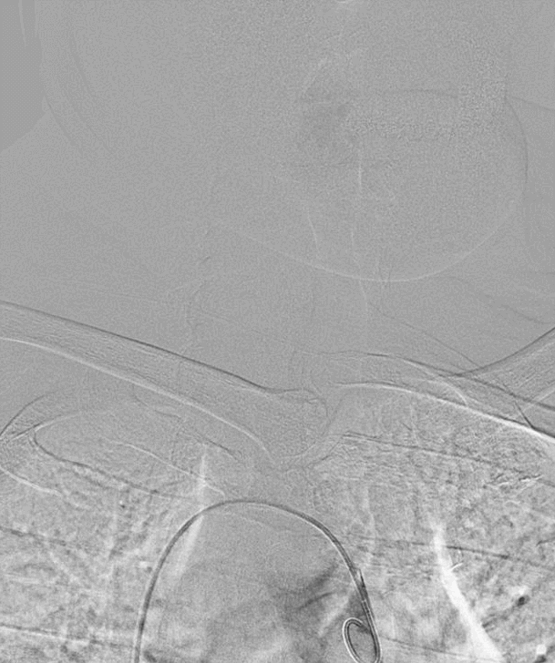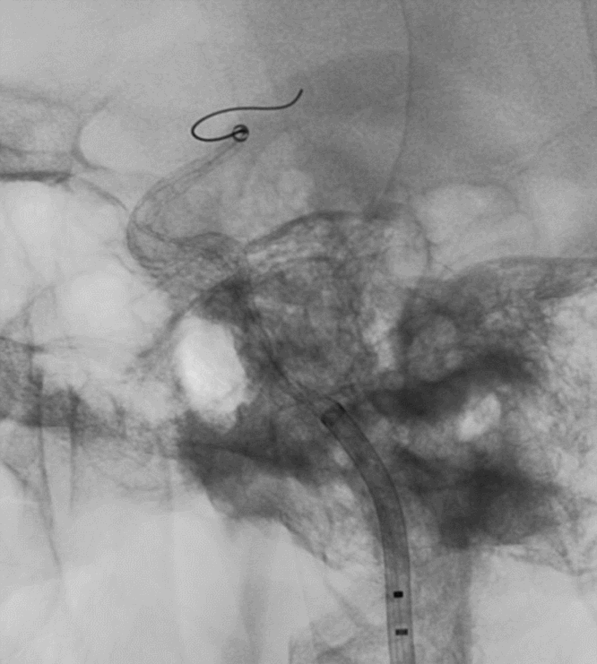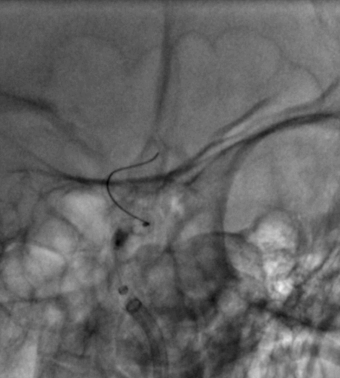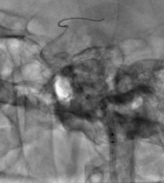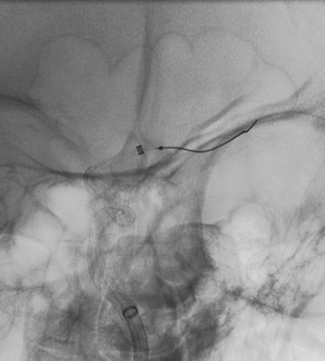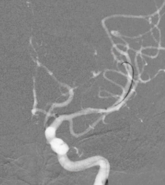 经Cat5完全释放支架后,拉推送杆后支架近端打开,后将Cat5跟进血流导向装置内尝试“按摩”,支架整体贴壁不够理想。