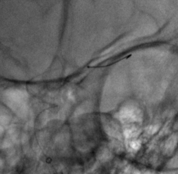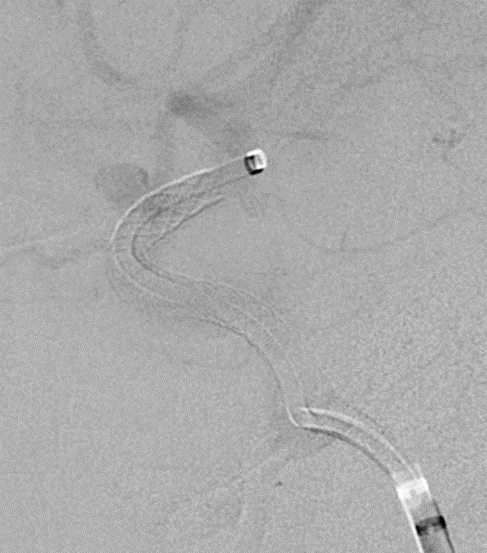 Cat5提供稳定通路,引入3.5mm×10mmHiryu球囊扩张由远端及近端扩张狭窄段及支架贴壁欠佳处