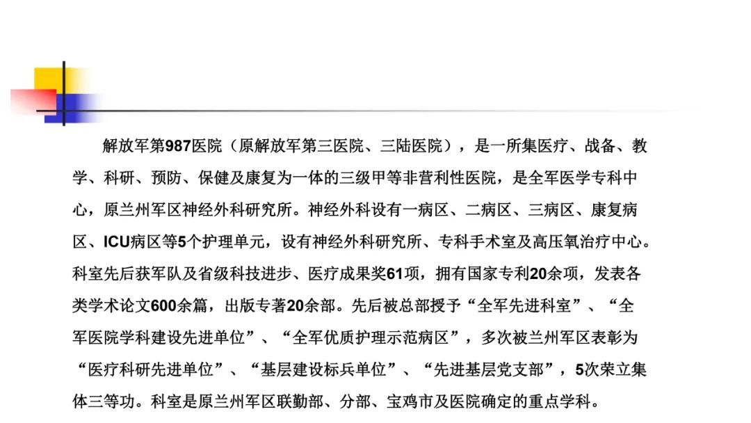 神经外科工作20余年,积累了丰富的临床、科研、教学经验。担任陕西省医师协会神经外科分会常委、陕西省神经外科学会青年委员,全军神经外科学会创伤学组委员。共获军内外各类奖项10项,其中军队及陕西省科技进步二等奖3项,军队科技进步及医疗成果三等奖4项。承担国家“十二五”科技支撑计划重大课题1项,完成全军和军区科研课题共6项。发表学术论文30余篇,其中发表SCI学术论文4篇,获宝鸡市首届德艺双馨十佳医师。擅长:颅内肿瘤,颅内动脉瘤,脊髓肿瘤,重型颅脑损伤及脑出血等神经重症疾病的外科手术治疗。指导或主刀完成神经外科高难度手术5000余例。