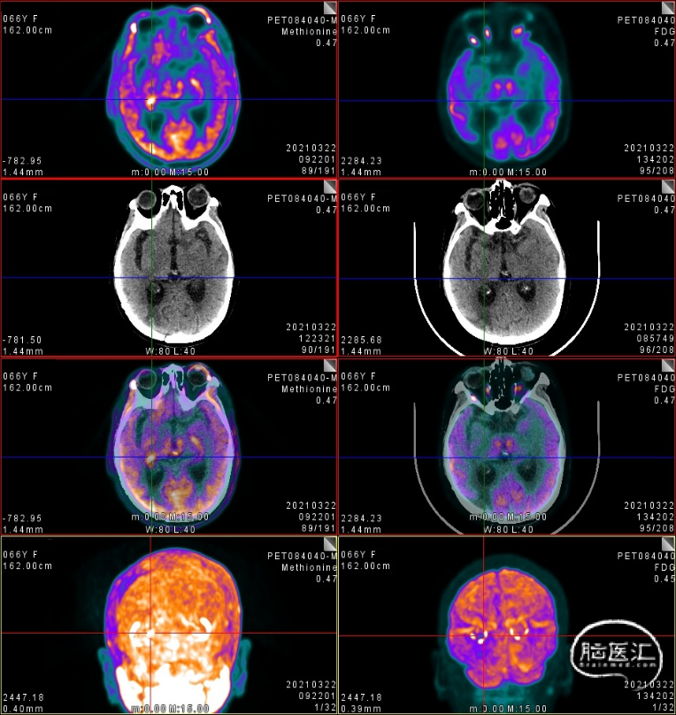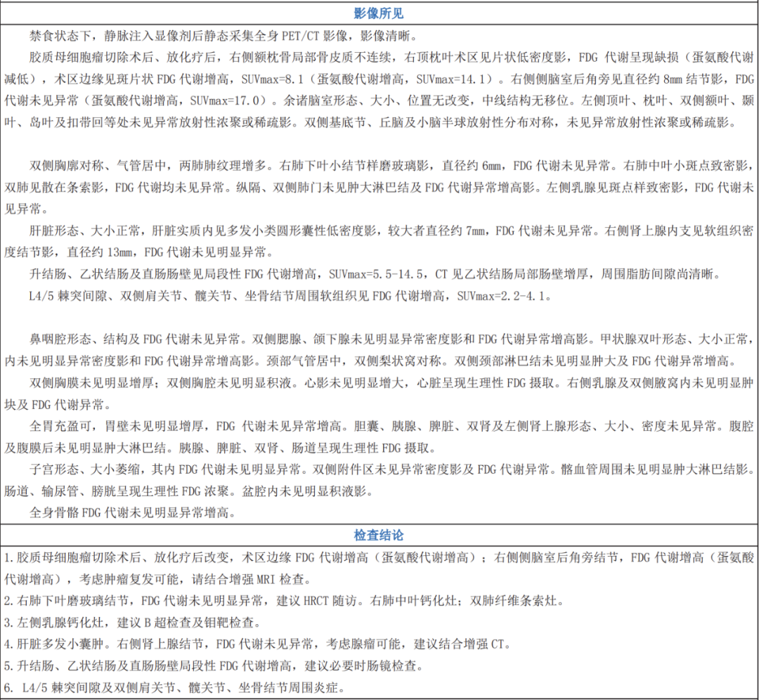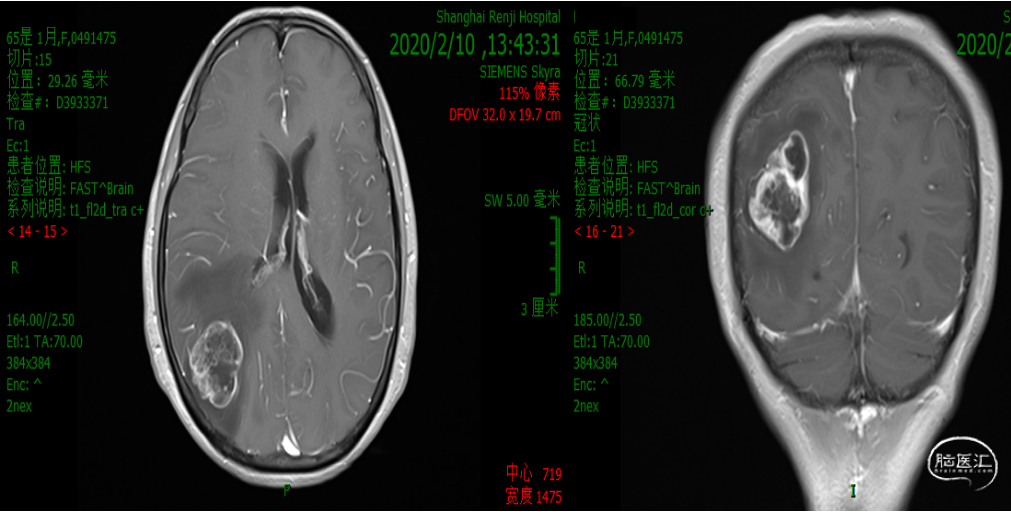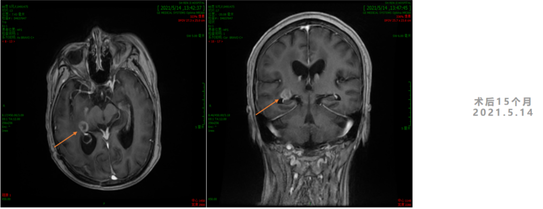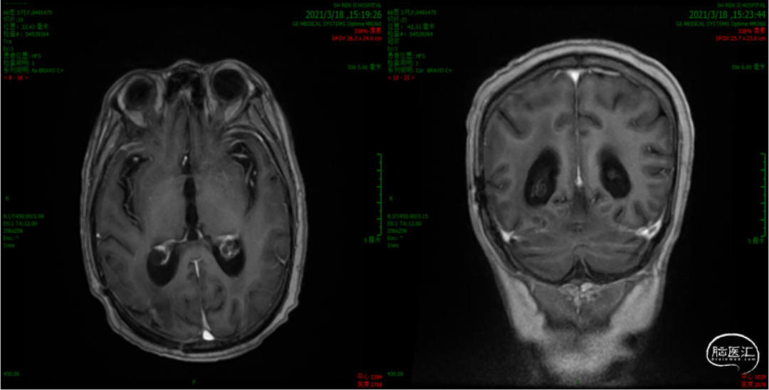 3. 2021年3月18日,2021年3月起,患者诉左侧肢体乏力,需搀扶行走。影像学检查显示,右侧脑室后角旁见结节样环形强化灶,直径7-8mm。MRS:NAA峰可见下降,Cho峰升高。Cho/Cr为0.748,Cho/NAA为2.13,考虑肿瘤复发可能。患者行射波刀治疗(24Gy/4FX),TMZ+安罗替尼2周期,TTFields重新定位,电场治疗调整贴片位置。