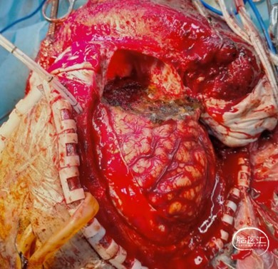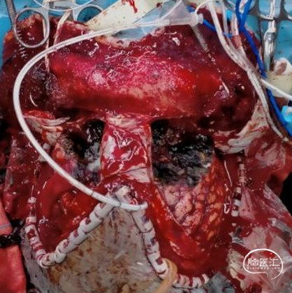 双侧同时打开骨瓣,可见硬膜呈暗黑色,张力较高。
