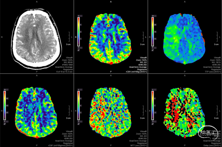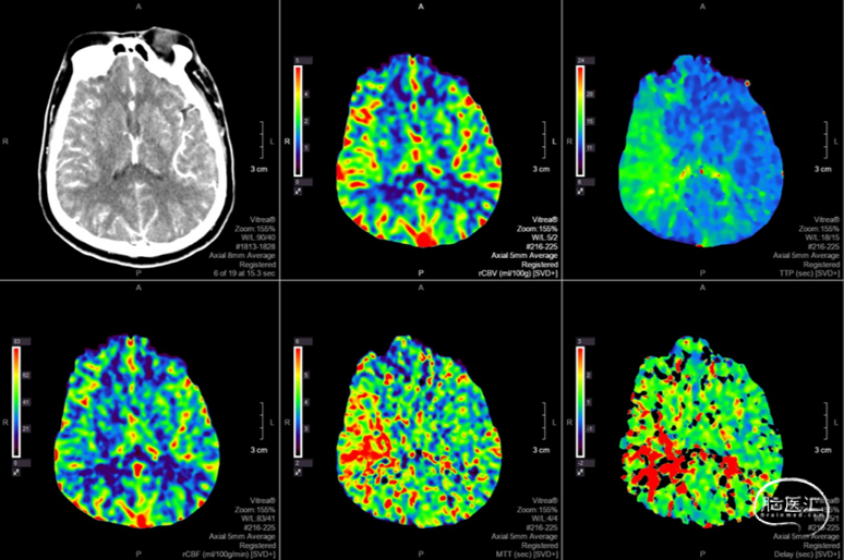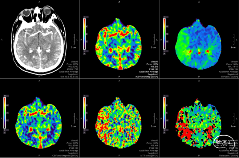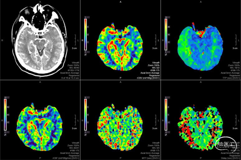 头颅CTP:右侧大脑中动脉区域明显低灌。