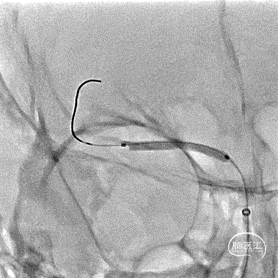 沿微导丝输送赛诺神畅 NOVA颅内药物球扩支架2.25*20mm支架到位,支架输送顺利,全过程无明显张力变化。