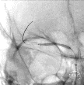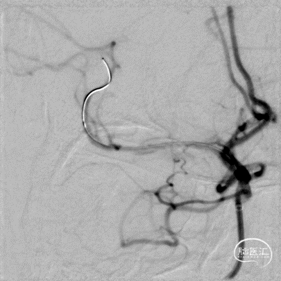 球扩后造影见闭塞段恢复正向血流M1段远端夹层表现。