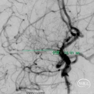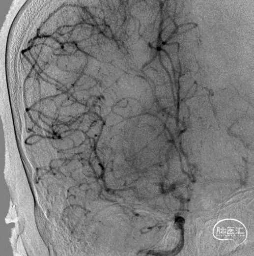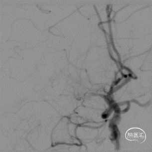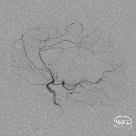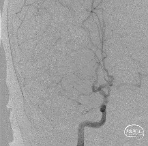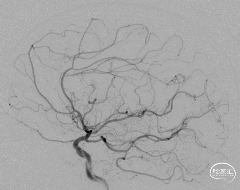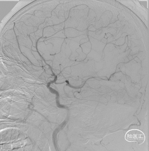 脑血管造影:右侧大脑中动脉M1段闭塞,代偿不足。