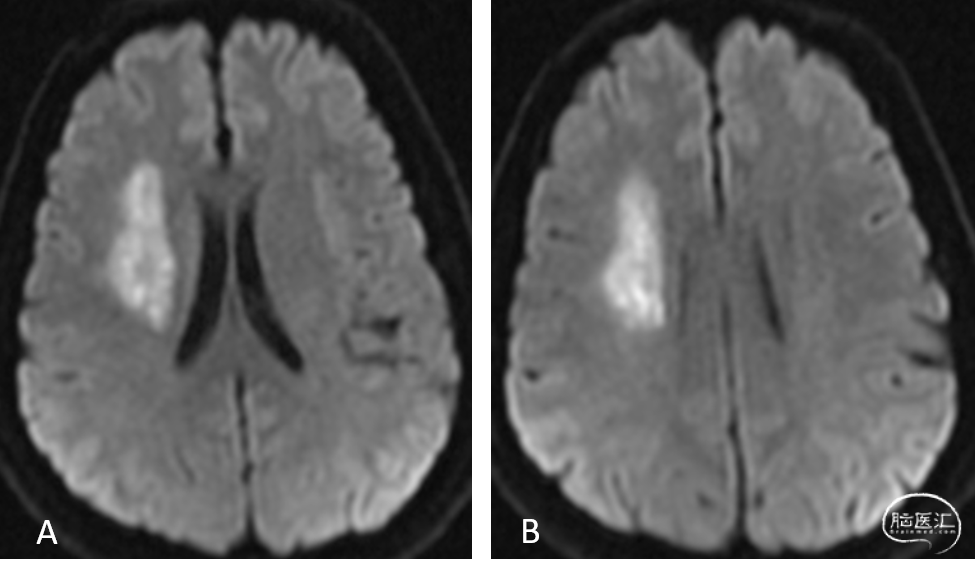 MR提示:右侧半卵圆区新发脑梗死(A、B)。
