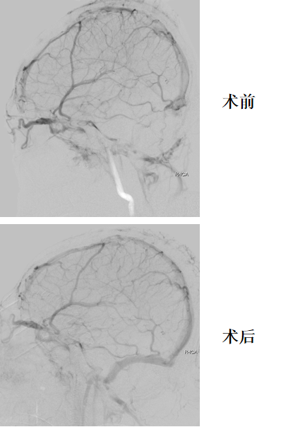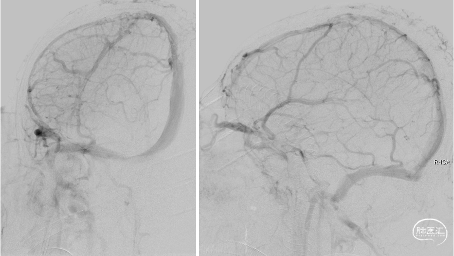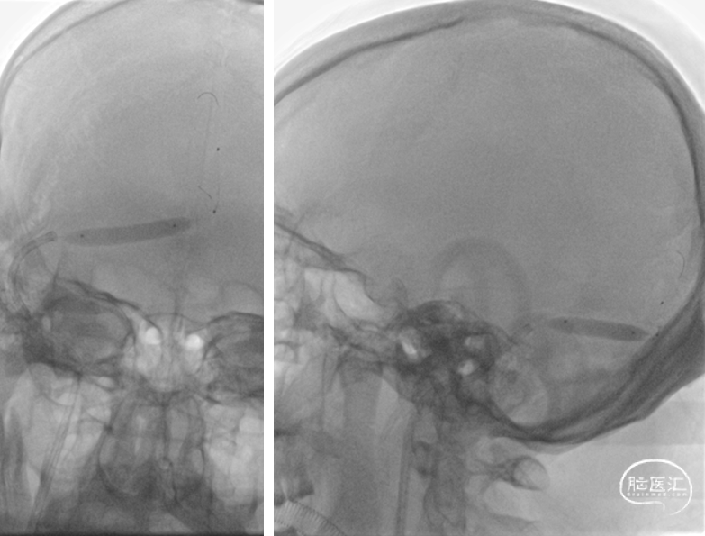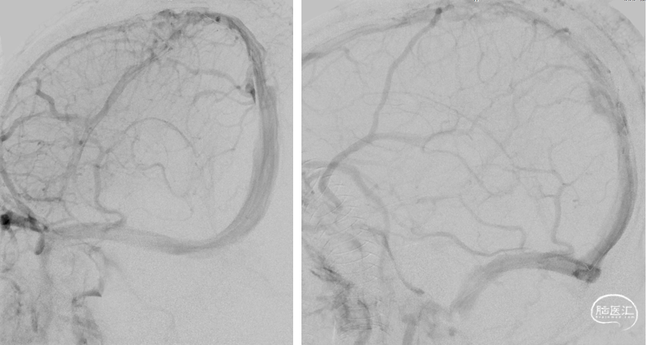 复查造影:上矢状窦显影明显改善,右侧横窦及乙状窦显影良好,静脉回流良好。行平板CT颅内未见出血。
