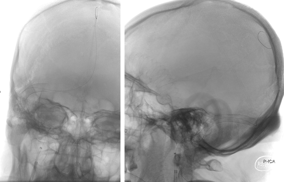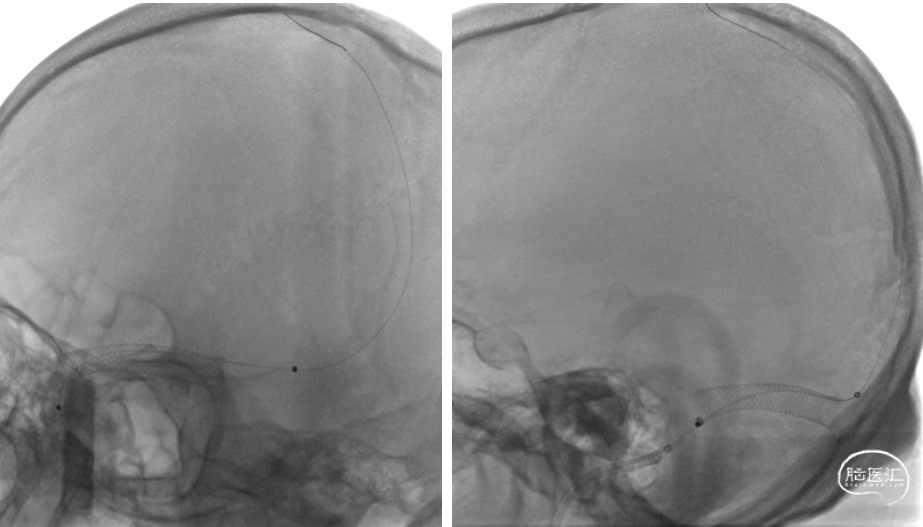 再次将导引导管置于右侧横窦及乙状窦进行负压抽吸,可见抽出暗红色血栓,手推造影示:静脉回流较前明显改善,右侧横窦及乙状窦仍显影欠佳,在260cm泥鳅导丝导引下将6FNavien中间导管置于右侧横窦,在Transend 300cm微导丝携带下将Wallstent7*40mm支架沿中间导管送至右侧横窦,定位准确后缓慢释放,复查造影右侧横窦显影良好,静脉回流明显改善,乙状窦显影仍欠佳,将Wallstent7*40mm支架沿中间导管送至乙状窦,定位准确后缓慢释放。