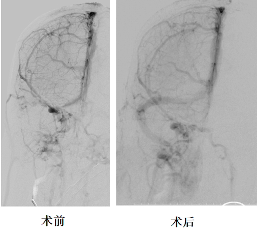复查造影:上矢状窦显影明显改善,右侧横窦及乙状窦显影良好,静脉回流良好