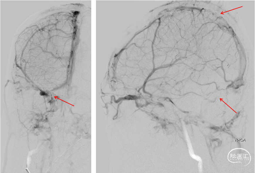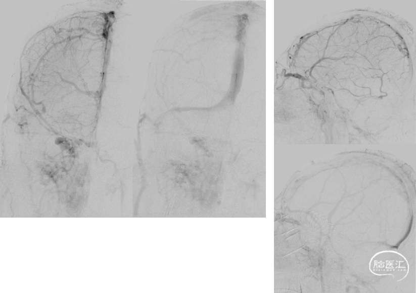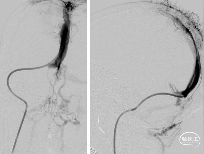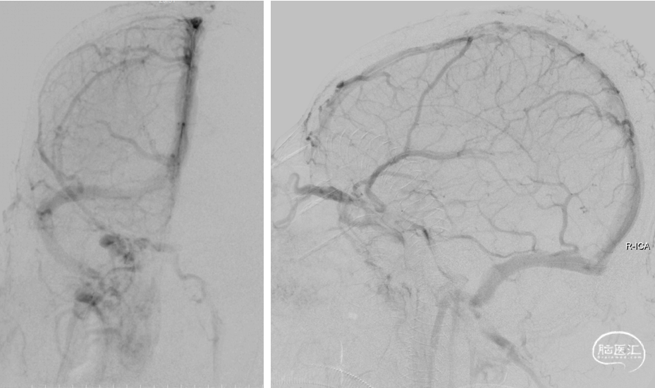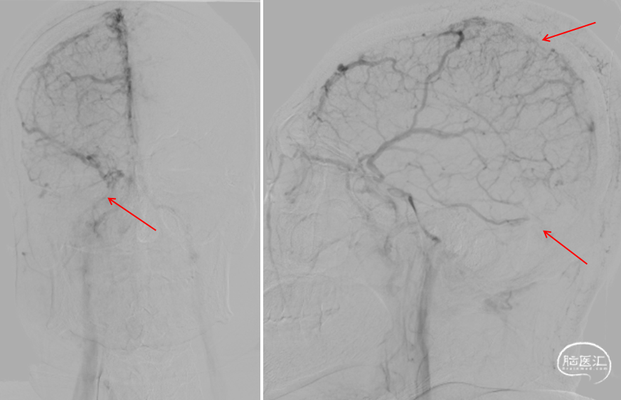 手推造影,静脉回流缓慢,上矢状窦仍显影欠佳