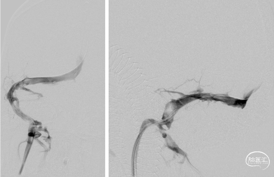 右侧颈总动脉造影示:上矢状窦显影模糊,右侧横窦、乙状窦未见显影,静脉回流缓慢。穿刺右侧颈静脉,留置8F血管鞘,全身肝素化,50万尿激酶入动脉滴注。