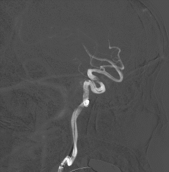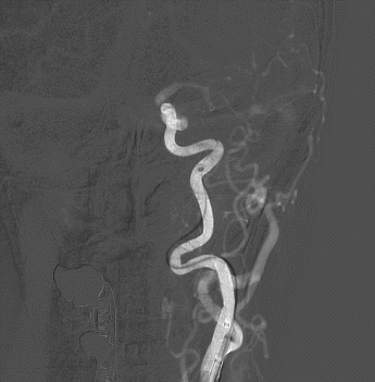 将6F 115cm SKATHI远端通路导管撤至左侧颈内动脉C1起始,多角度造影显示左侧颈内动脉眼动脉段狭窄明显改善,颈内动脉通畅,颅内血流改善。